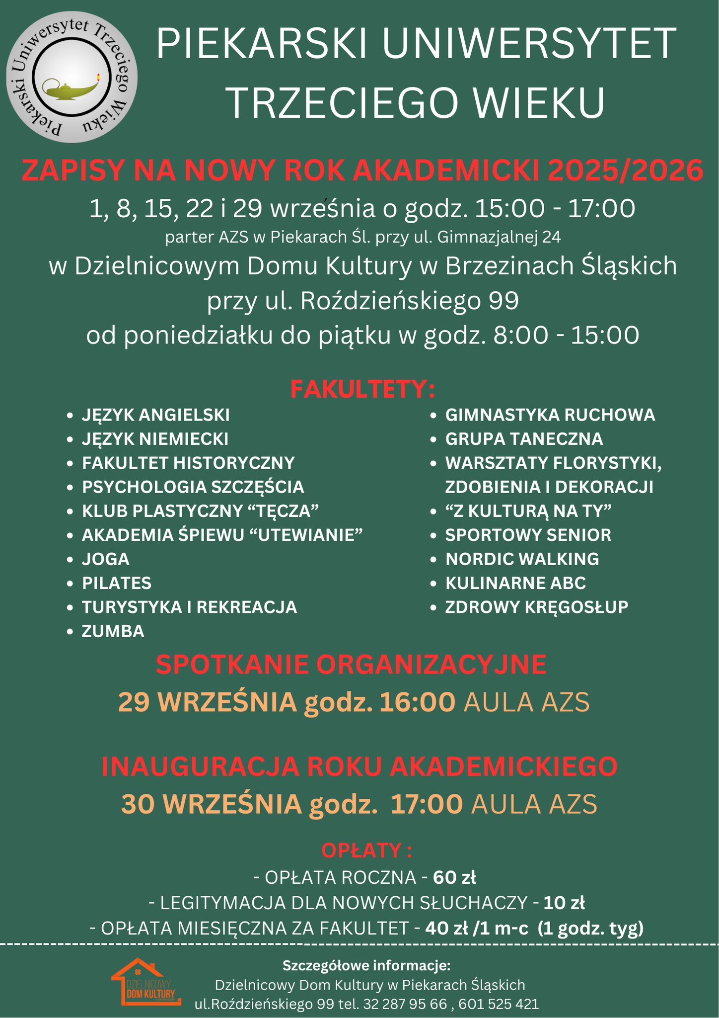 Nowy, dwudziesty już Rok Akademicki na Piekarskim Uniwersytecie Trzeciego Wieku rozpoczął się 30 września 2025 roku. Nadano mu szczególny, Jubileuszowy charakter. Było to podniosłe wydarzenie nie tylko dla około 190 naszych Słuchaczy, ale również dla środowiska społecznego całego miasta.