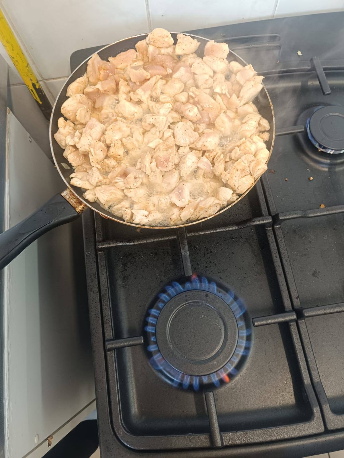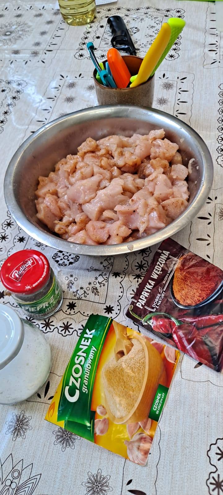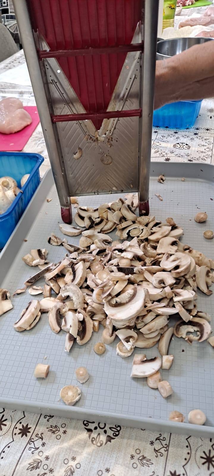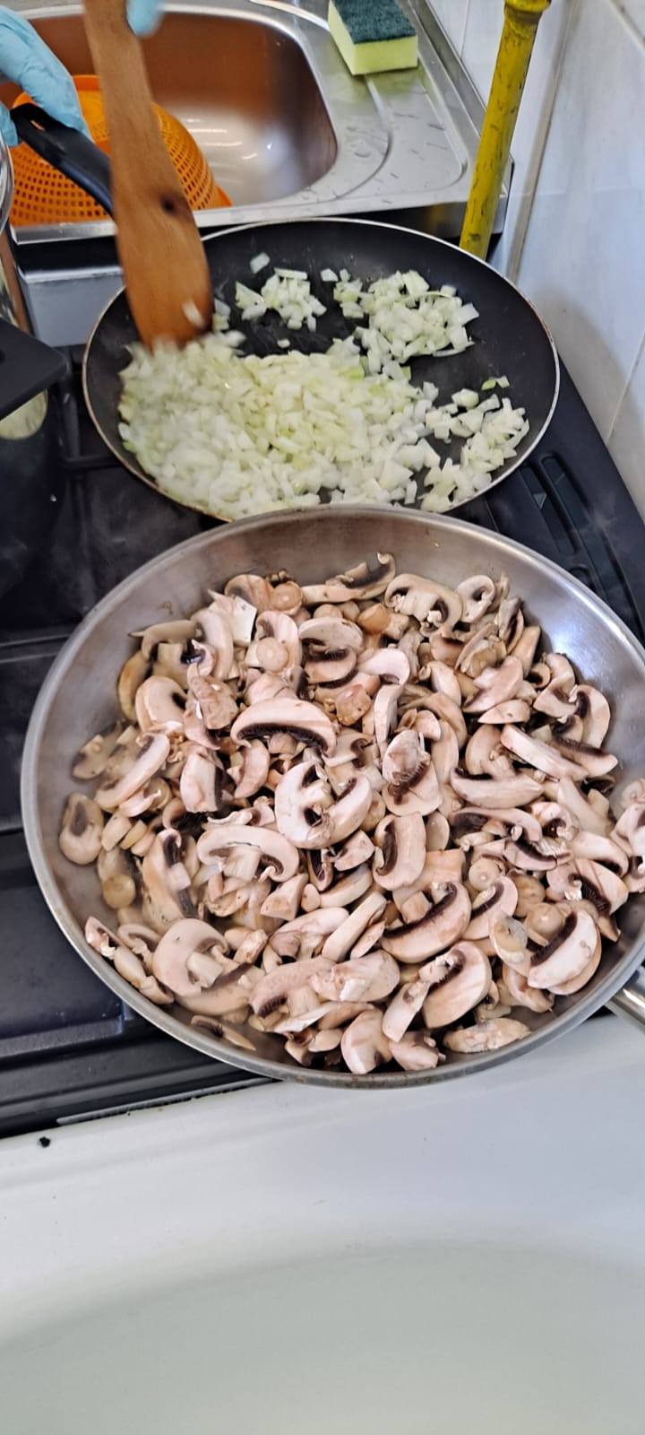 Sprawnie przygotowano produkty : pieczarki posiekano i podsmażono, filet z kurczaka pokrojony w kostkę obsypano przyprawami i następnie usmażono z cebulą